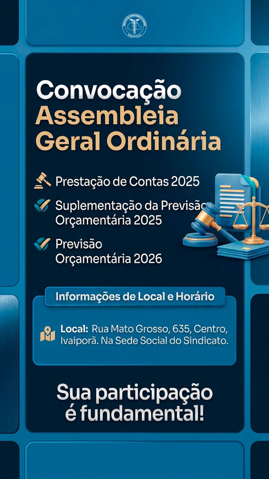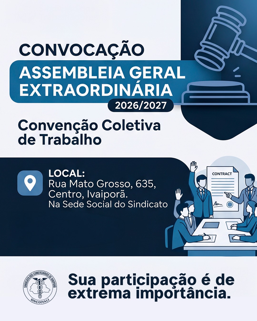 A Presidente do SINDICATO DOS EMPREGADOS NO COMÉRCIO DE IVAIPORÃ, no uso das atribuições que lhe conferem o estatuto da entidade e a legislação vigente, convoca os senhores associados quites com a tesouraria e em condição de votar, para participarem da Assembleia Geral Ordinária, a ser realizada no dia 28 de abril de 2026 as […]